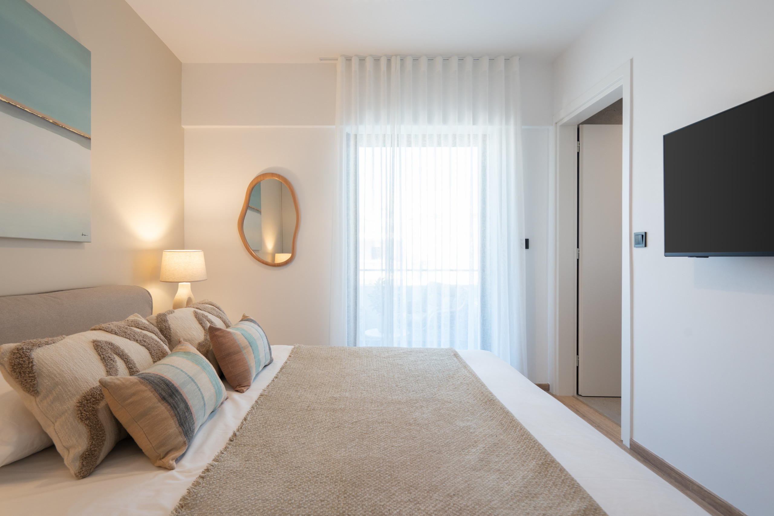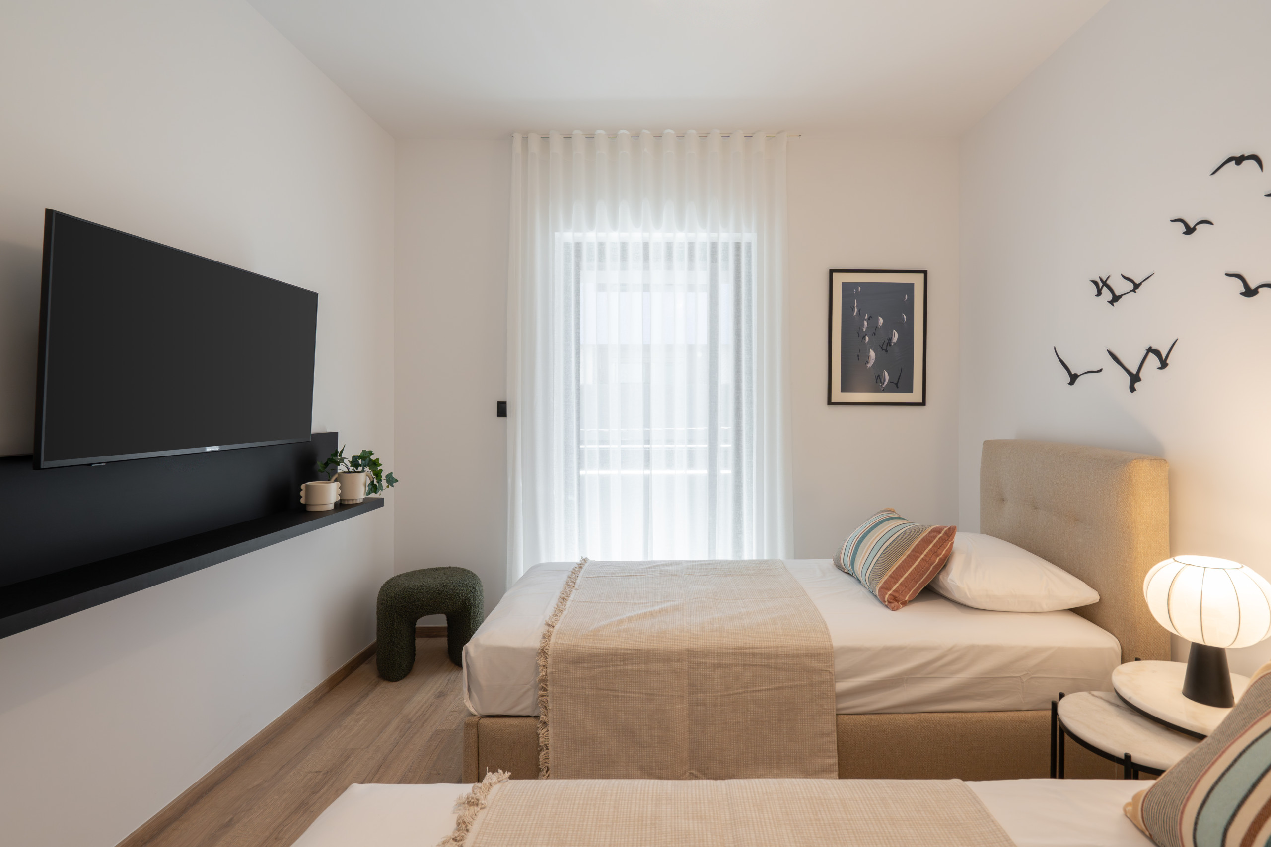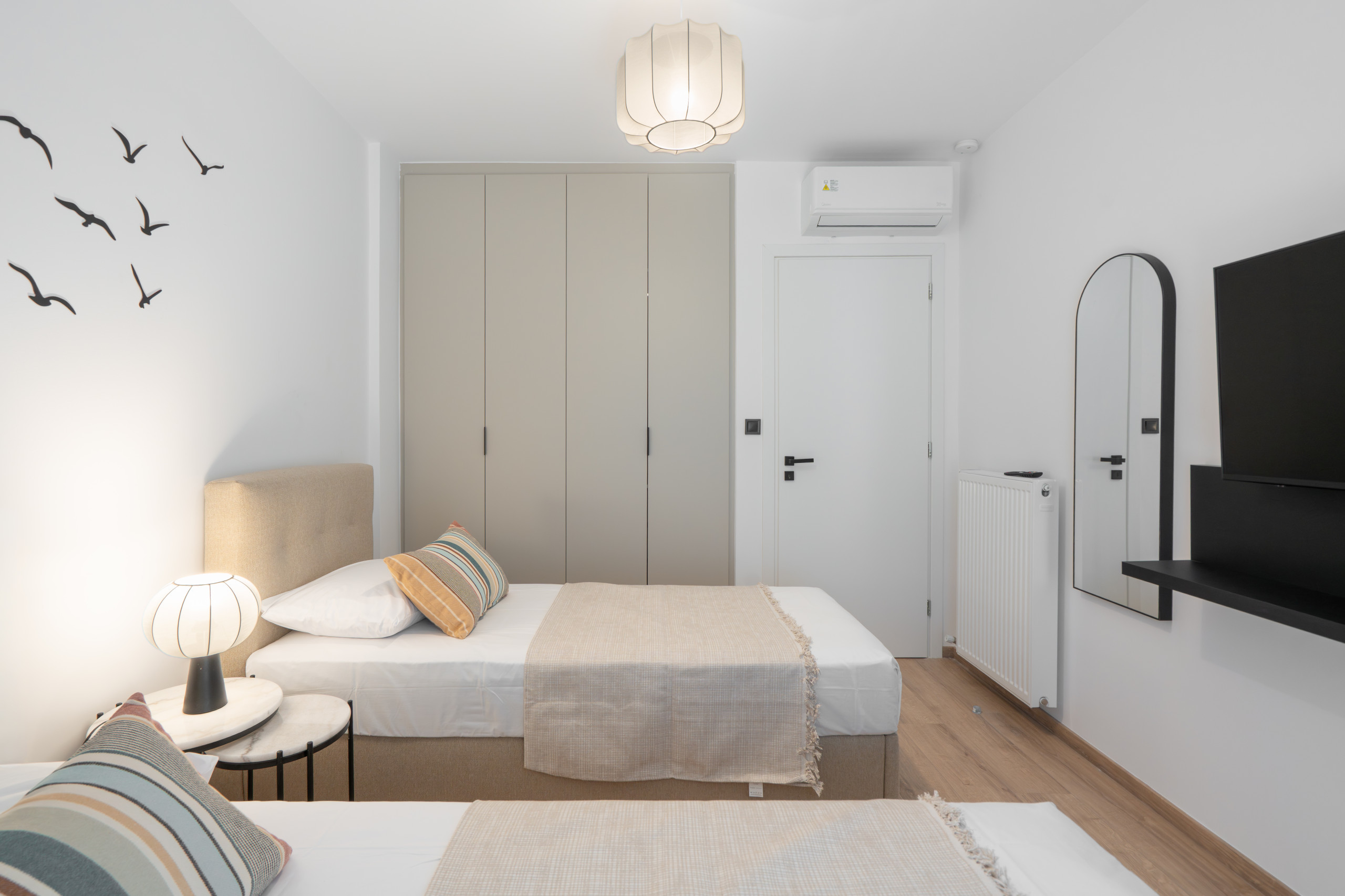 Paros embodies a relaxed, contemporary vibe. Two airy bedrooms and two modern bathrooms provide space for everyone, while the living and dining area invites conversation, morning coffee, or ferry planning. Natural light fills the apartment, bouncing off crisp neutrals and smooth surfaces to create a calm, effortless atmosphere.