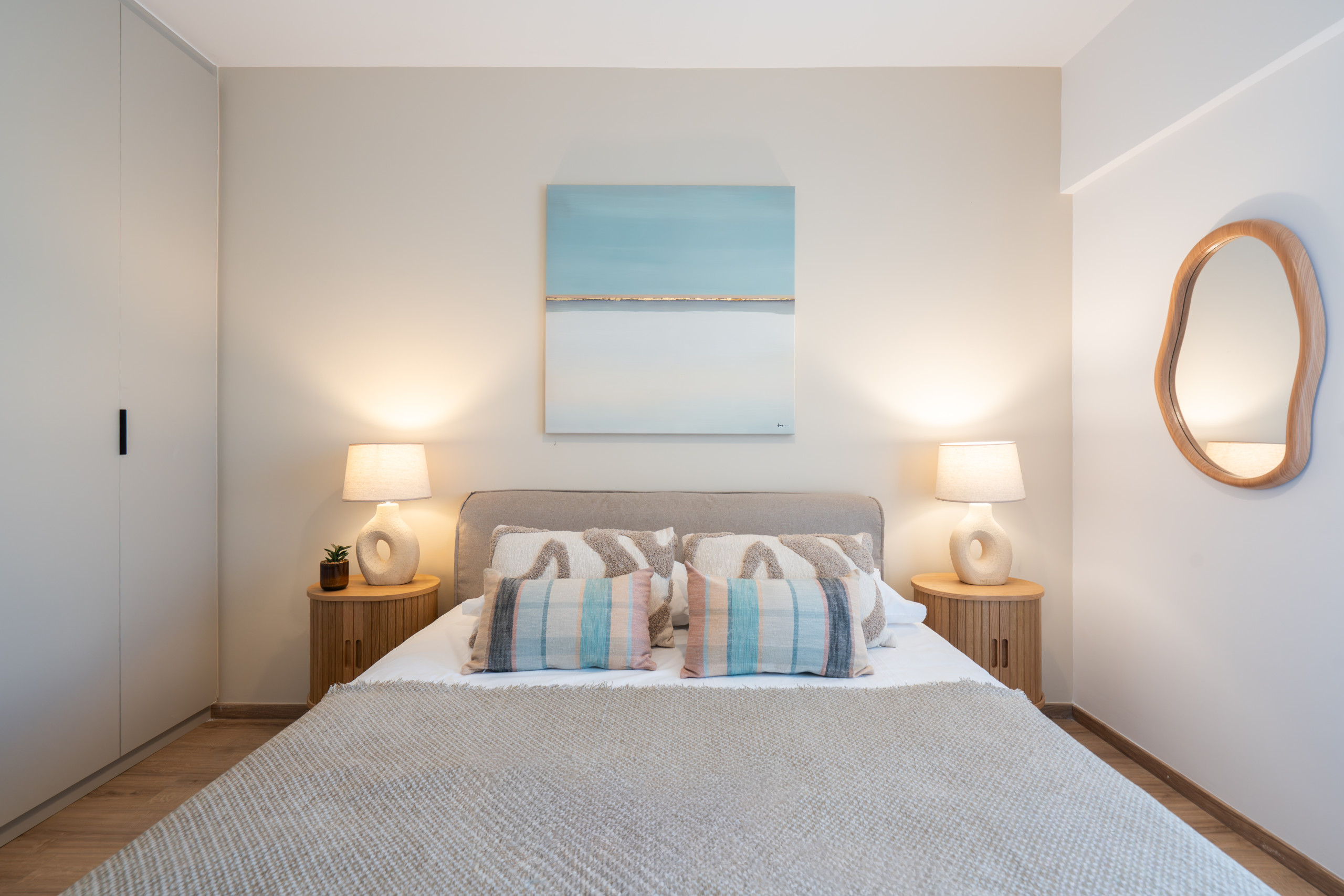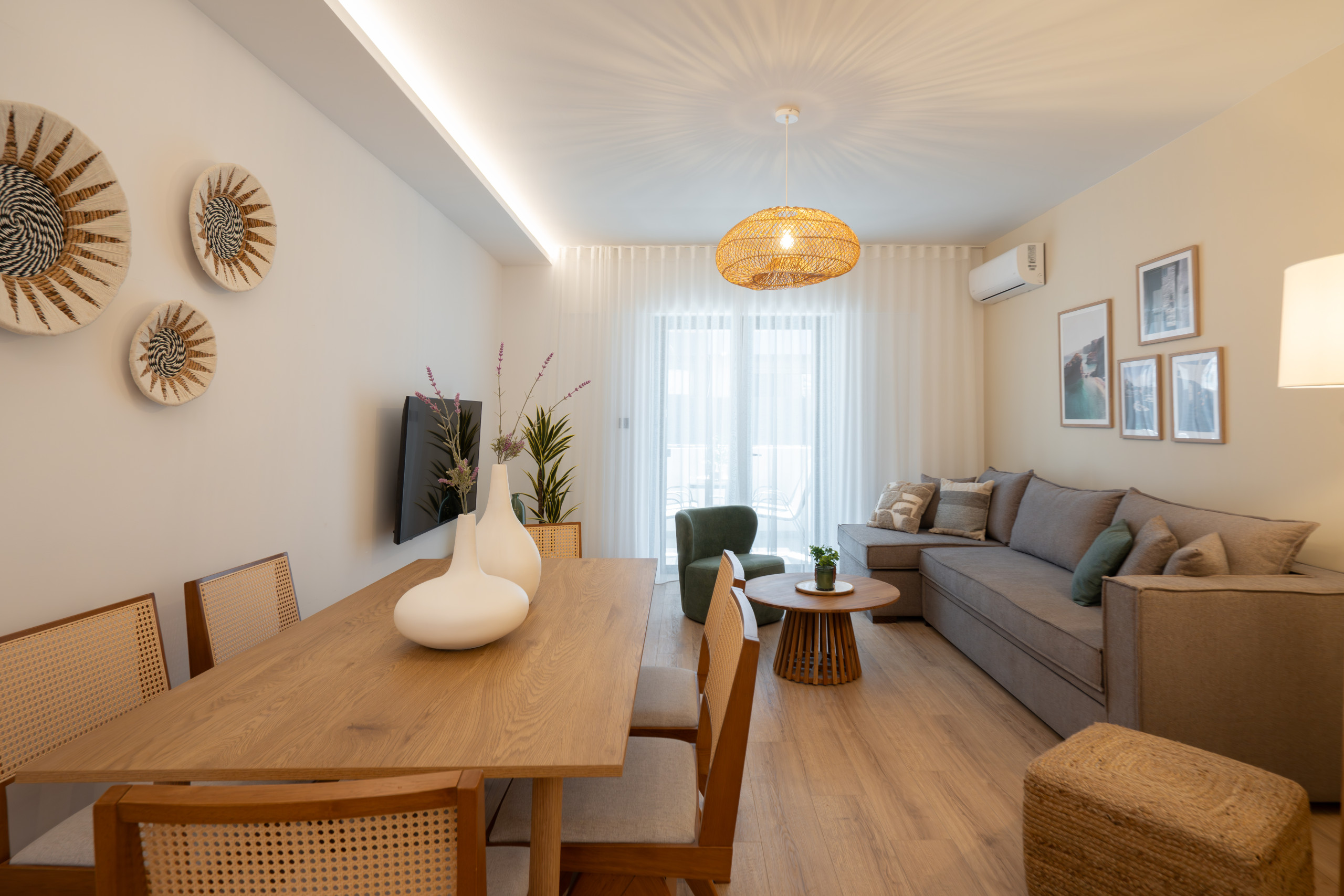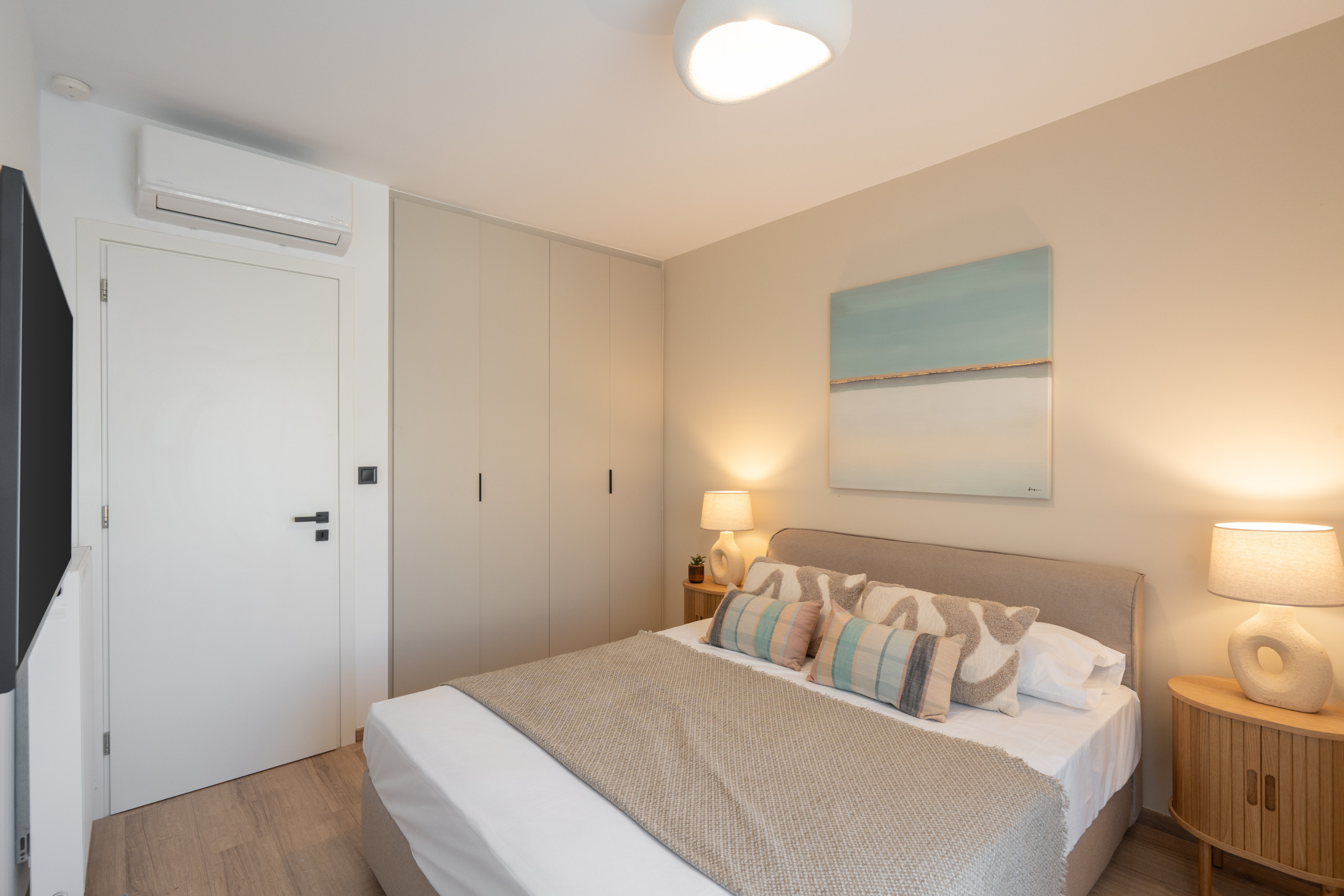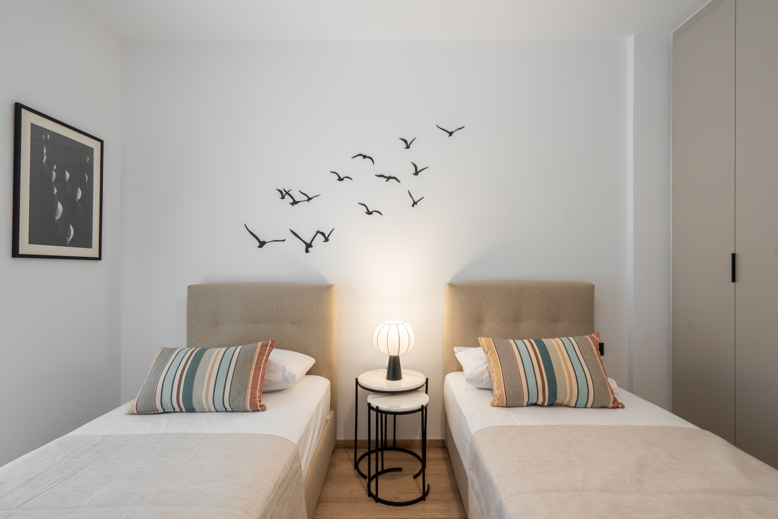 Paros embodies a relaxed, contemporary vibe. Two airy bedrooms and two modern bathrooms provide space for everyone, while the living and dining area invites conversation, morning coffee, or ferry planning. Natural light fills the apartment, bouncing off crisp neutrals and smooth surfaces to create a calm, effortless atmosphere.