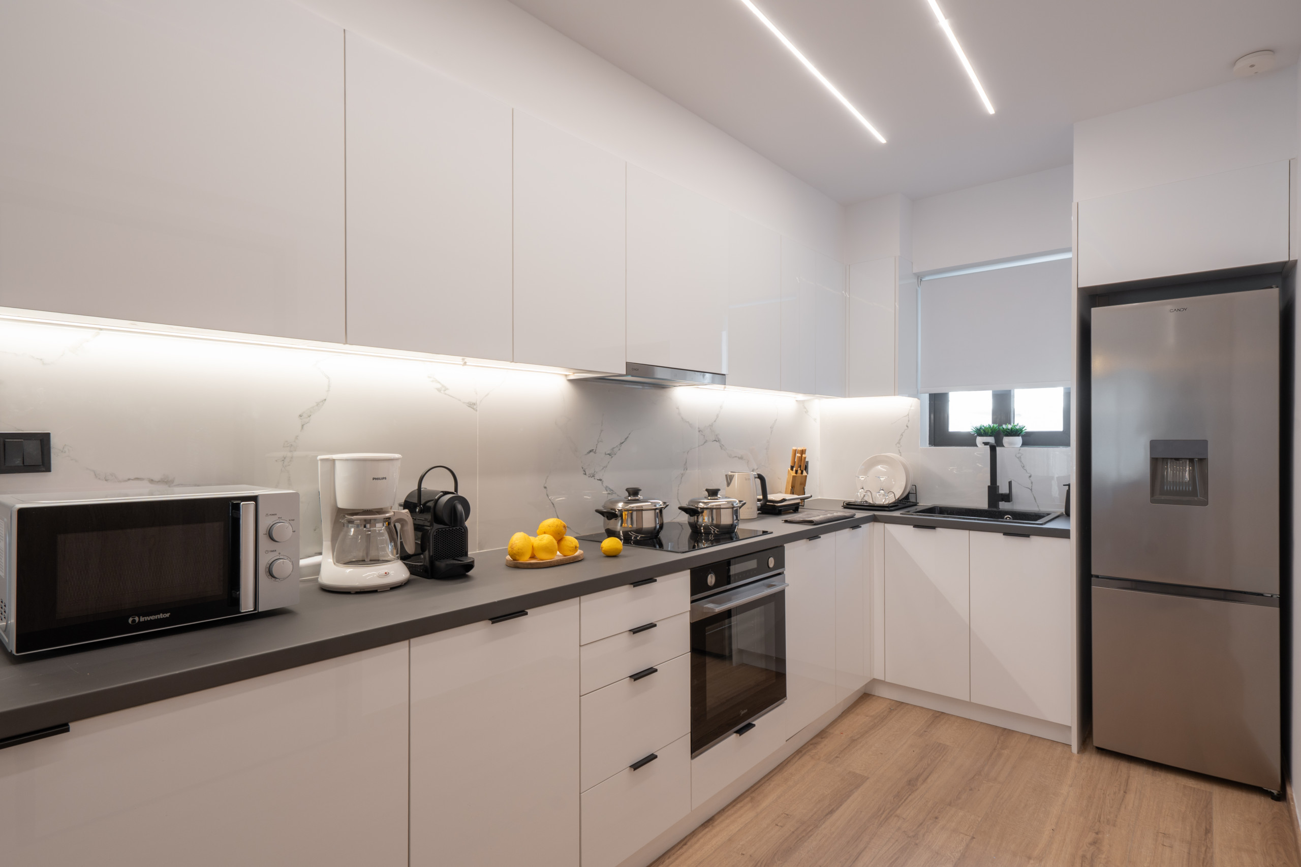 In the hotplate of glass ceramics open plan kitchen, refrigerator, microwave, oven, dishwasher, dishes/cutlery, kitchen utensils, coffee machine and toaster are provided.