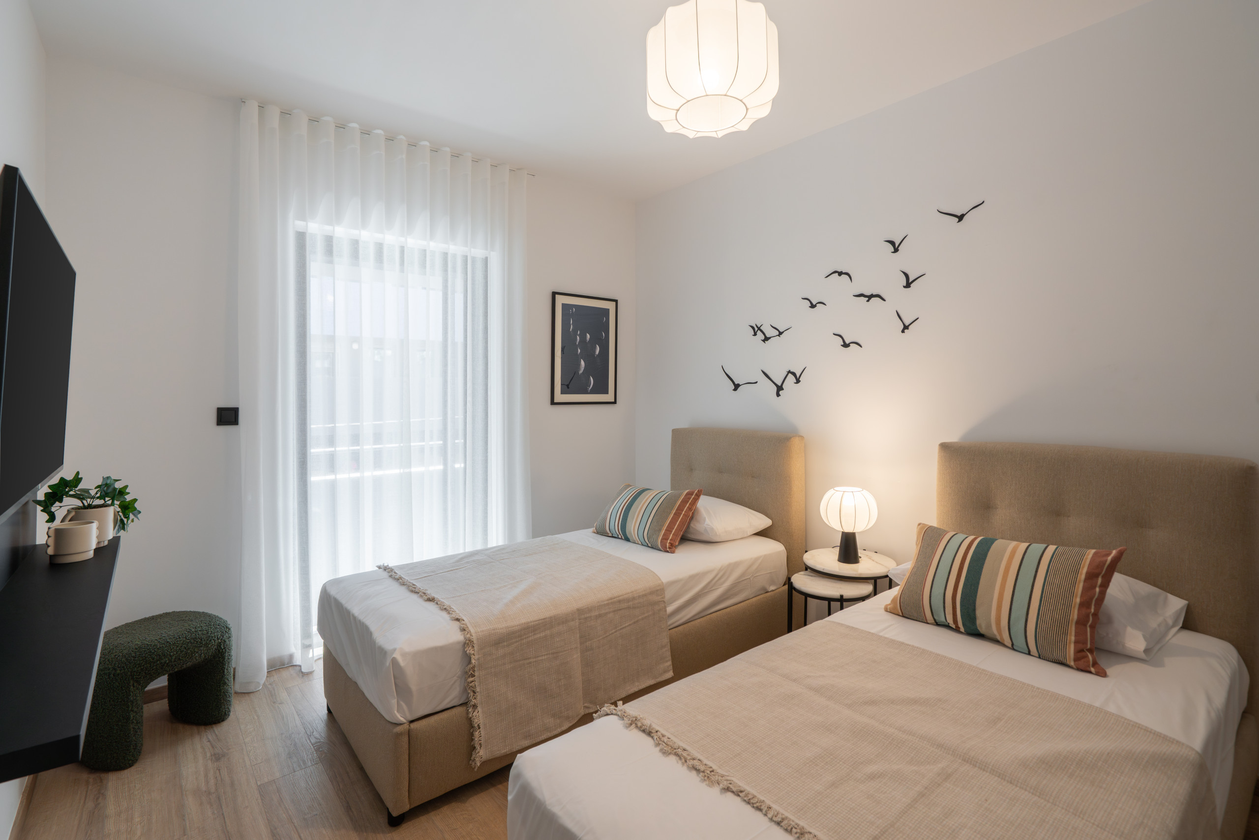 The layout is smart and simple: a cosy open-plan living and dining area, a fully equipped kitchen (with a dishwasher, microwave, and coffee machine), and two full bathrooms so everyone can get ready without the morning scramble. Smart TVs in every room, double beds in both bedrooms, and a sofa bed in the living room mean flexibility and comfort all around—whether you’re in chill mode, work mode, or hosting a casual dinner with local takeout and a bottle of wine.